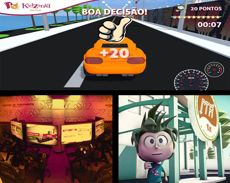 Car simulator developed for Kidzania Brazil featuring 3D intros and a cartoonish look and feel. The game-play experience challenges players to accumulate points by obeying traffic rules.